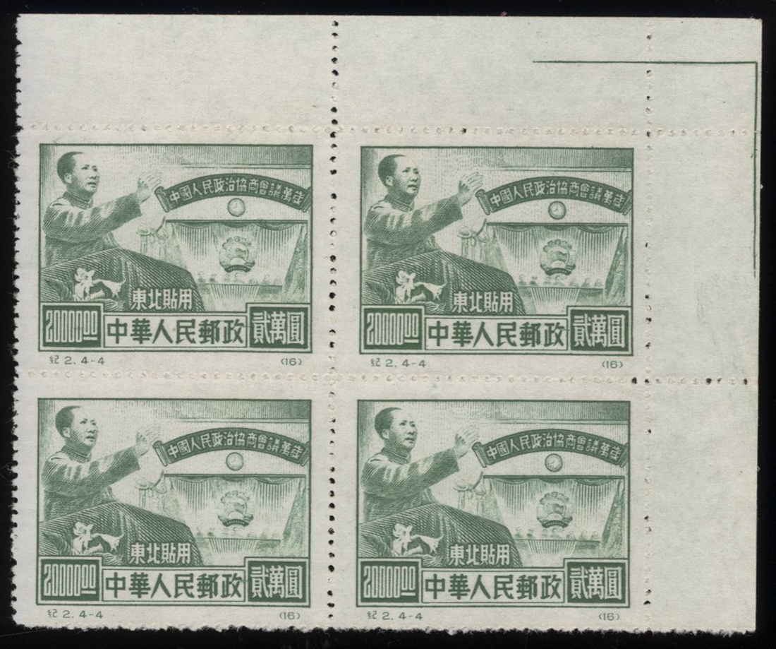 1950年紀東2政治協商會議東北貼用原版新票四方連1套,均帶廠銘直角邊,票面顏色鮮豔,齒孔完整,品相佳
