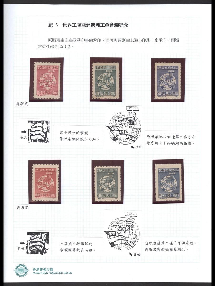 1949年紀3世界工聯亞洲澳洲工會會議原再版新票各一套,票面顏色鮮豔,齒孔完整,附原藏家參展貼票,上中品