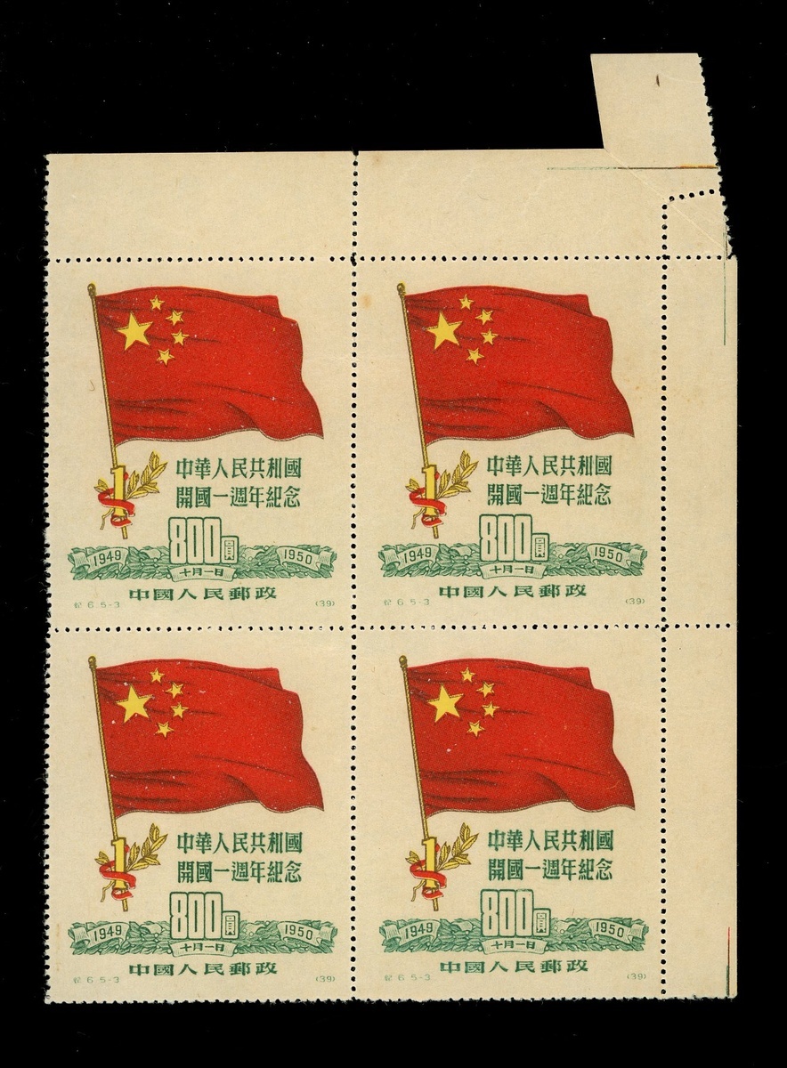 1955年紀6開國一周年紀念再版800元新票四方連1件,帶右上直角邊,邊紙福耳變體,票面顏色鮮豔,齒孔完整,上中品