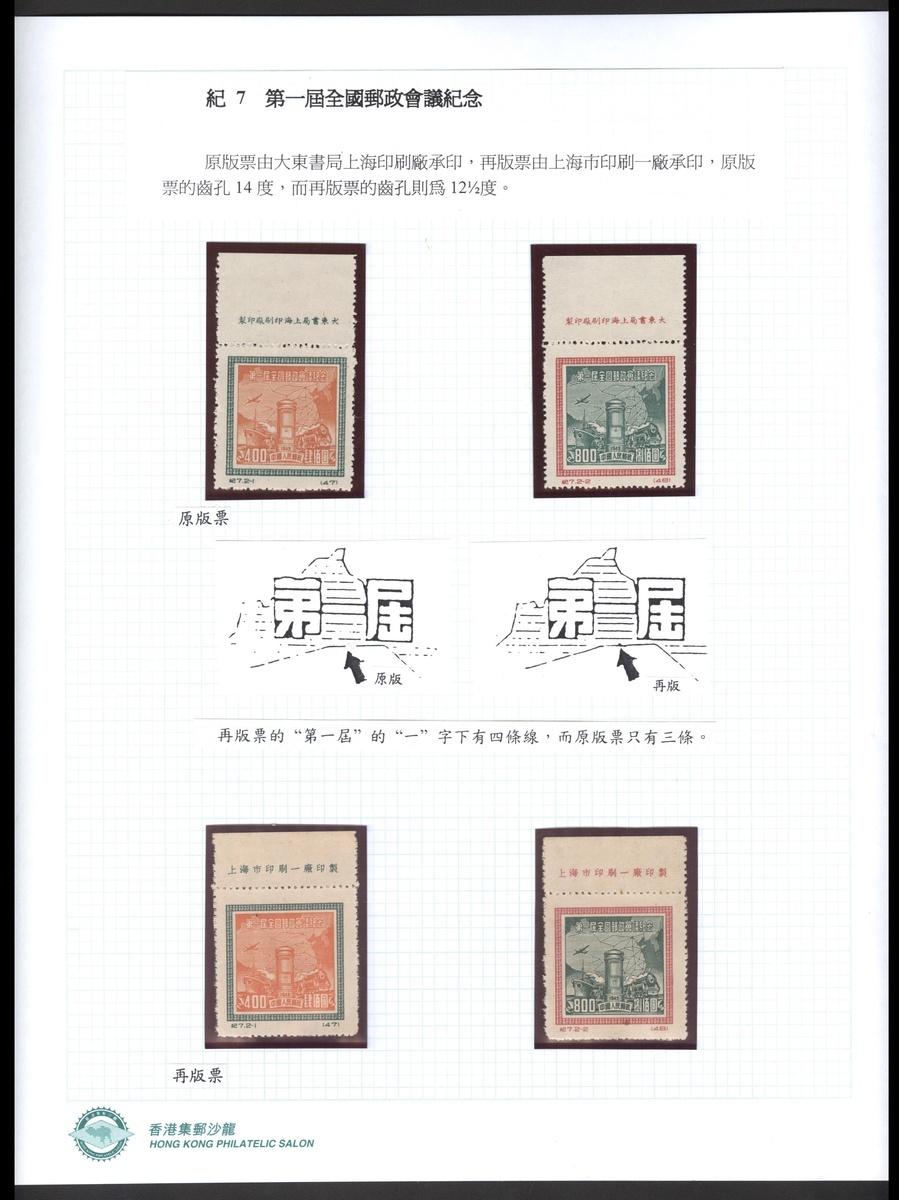1950年紀7郵政會議原再版新票各一套,均帶上廠銘邊紙,票面顏色鮮豔,齒孔完整,附原藏家參展貼票,上中品