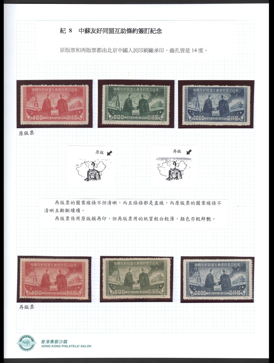 1950年紀8中蘇友好原再版新票各一套,票面顏色鮮豔,齒孔完整,附原藏家參展貼票,上中品