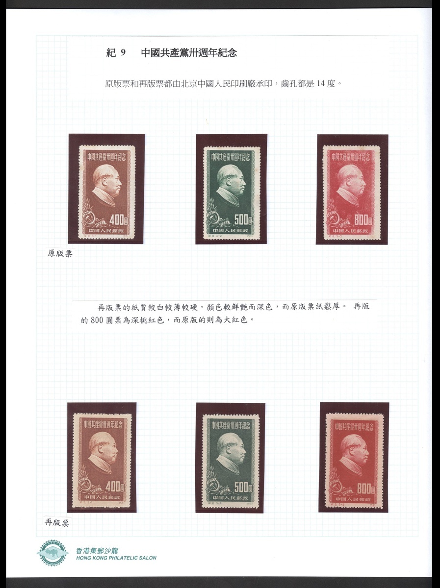 1951年紀9建黨原再版新票各一套,票面顏色鮮豔,齒孔完整,附原藏家參展貼票,上中品