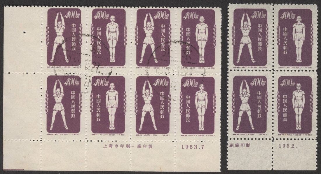 1952 (20 Jun.) Gymnastics by Radio (S4) $400 complete set of 10 blocks with bottom margin; another complete reprint set of 10, blocks in pair with corner margin, C.T.O., fine. Yang S14-S53