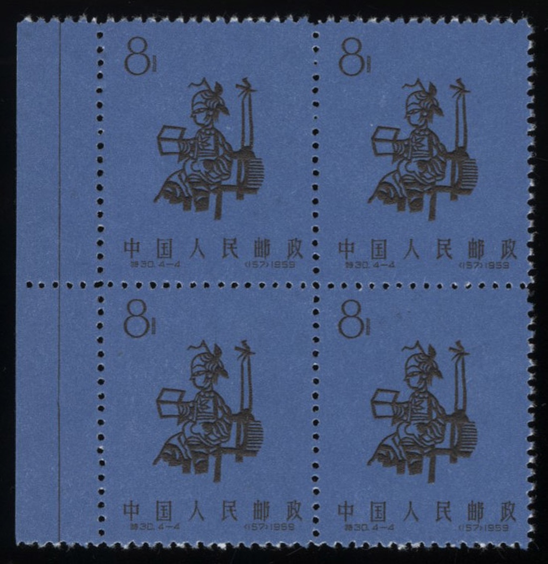 1959年特30剪紙新票四方連1套,均帶邊紙,票面顏色鮮豔,齒孔完整,背面紙質白淨,品相佳