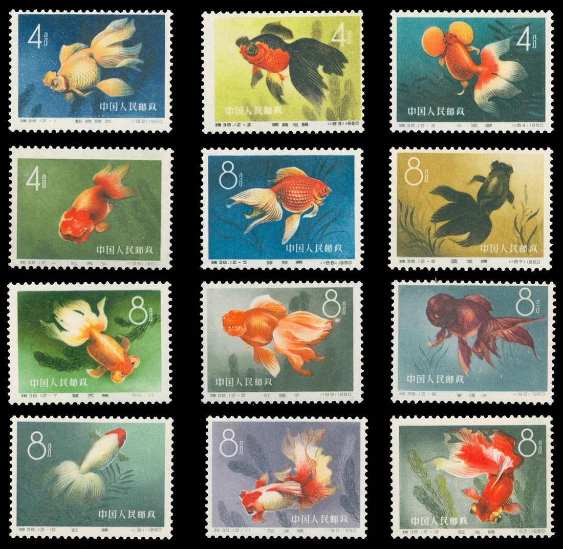 1960年特38金魚新票1套,票面顏色鮮豔,齒孔完整,原膠,膠色一致且水潤,品相極佳