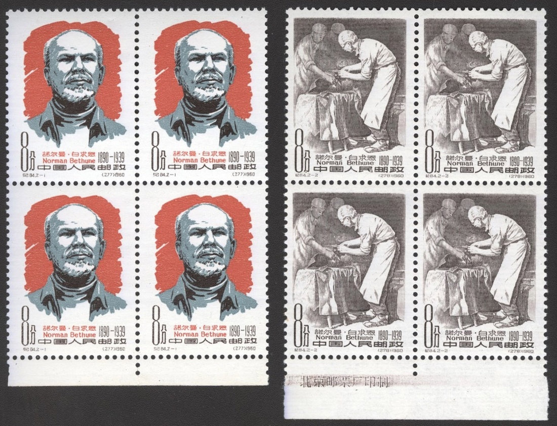 1960 (20 Nov.) Dr. Norman Berhune Commemoration (C84) 8f. complete set of two in block of four with bottom margin, with a toned spot at the back, fine. Yang C277-C278