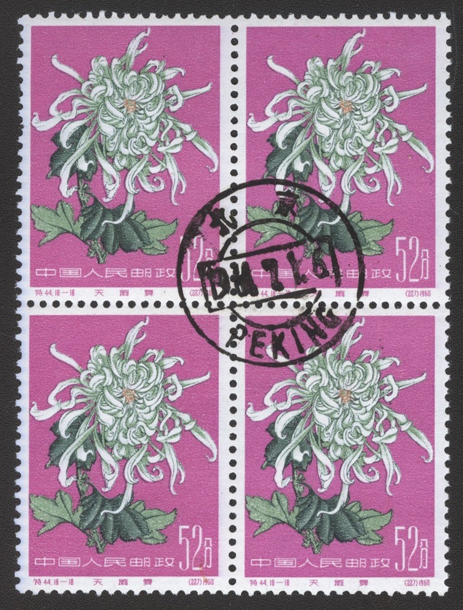 1960年特44菊花蓋銷票四方連1套,票面顏色鮮豔,齒孔完整,圖案居中,原膠,其中第3,4,11枚背膠有污漬,整體品相佳