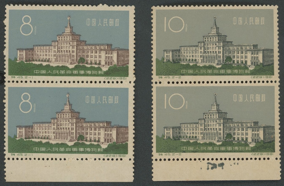 1961年特45軍事博物館新票直雙連1套,帶下邊紙,其中8分為229錯號,票面顏色鮮豔,齒孔完整,原膠,背膠微黃,上中品