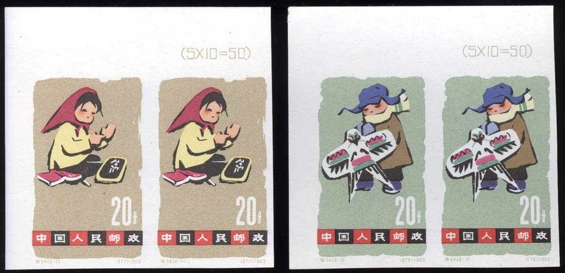 1963年特54兒童無齒新票橫雙連1套,均帶上廠銘或數字邊紙,票面顏色鮮豔,裁切整齊,紙質白淨,品相佳