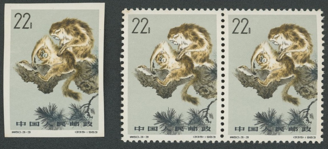 1963年特60金絲猴有齒新票橫雙連1套,無齒新票1套,票面顏色鮮豔,齒孔完整,原膠,背膠泛黃,上中品