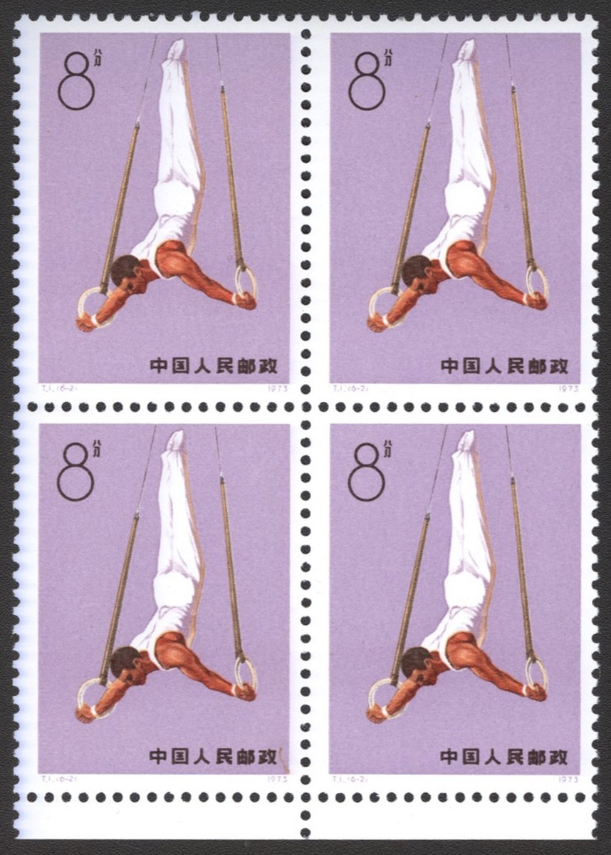 1974 (1 Jan.) Gymnastics (T1) 8f. complete set of six in block of four with imprint margin except no.2, very fine. Yang T1-T6