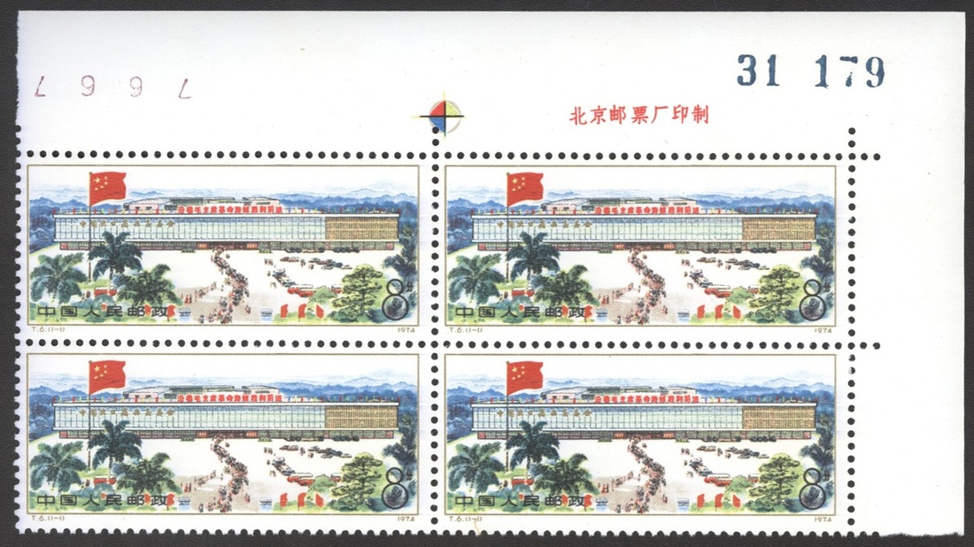 1974年T6中國出口商品交易會新票四方連1套,帶右上廠銘直角邊紙,票面顏色鮮豔,齒孔完整,上中品