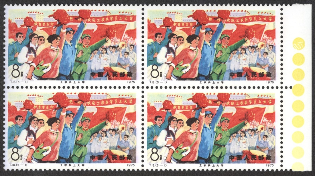 1976年T18工農兵上大學新票四方連1套,均帶色標或廠銘邊紙,顏色鮮豔,齒孔完整,原膠,個別票背微黃,上中品