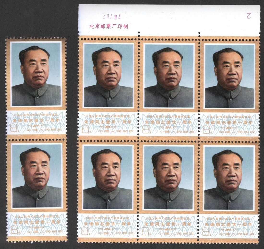 1977年J19朱德逝世一周年新票14套,包括六方連2套,直雙連2套,部分帶廠銘或色標邊紙,票面顏色鮮豔,金粉閃亮,齒孔完整,原膠,上中品