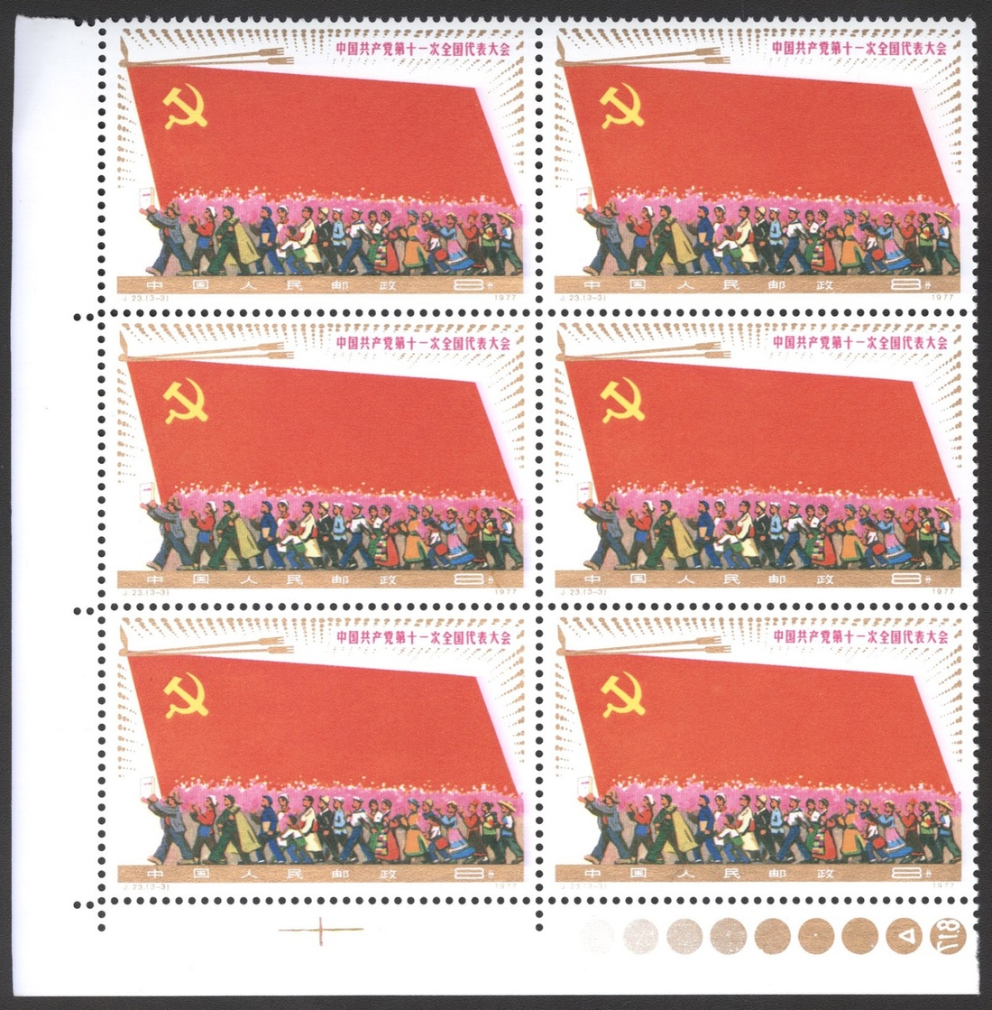 1977年J23第十一屆全國代表大會新票六方連1套,均帶左下色標直角邊紙,顏色鮮豔,齒孔完整,原膠,品相佳
