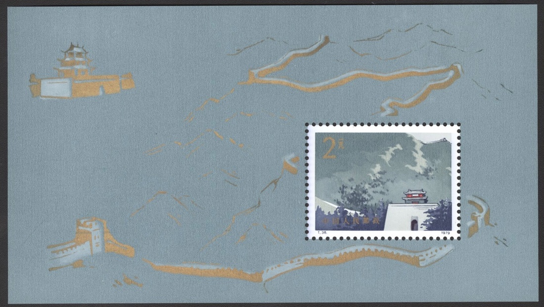 1979年T38M長城小型張新票1枚,票面顏色鮮豔,金粉閃亮,四角尖,原膠,品相佳