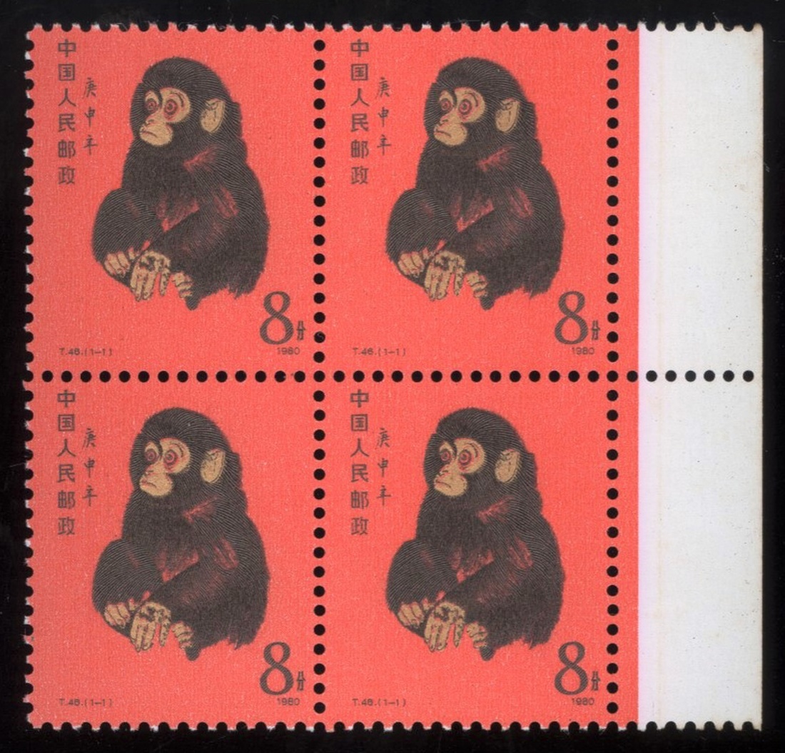 1980年T46庚申年新票四方連1件,帶右邊紙,票面顏色鮮豔,金粉閃亮,齒孔完整,原膠,邊紙微黃,品相佳