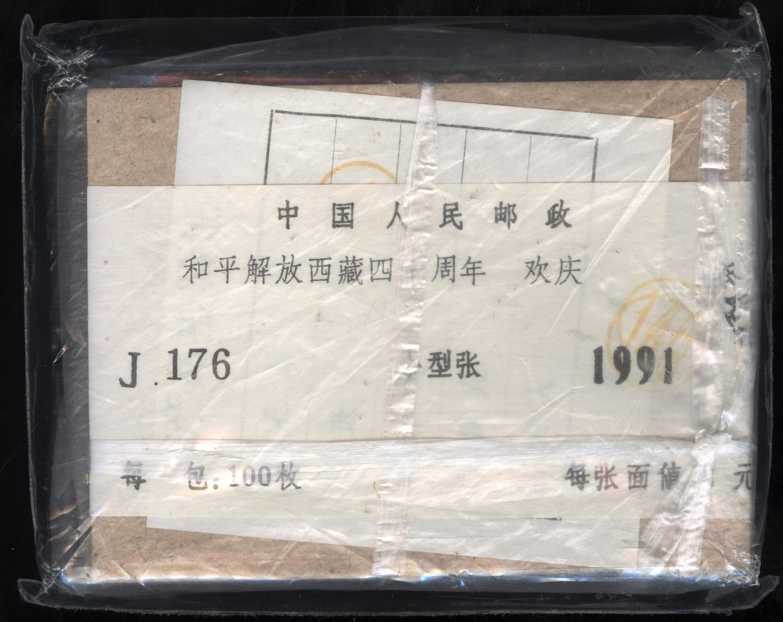 1991年J176M西藏和平解放小型張1盒,共100枚,原封未拆,保存完好