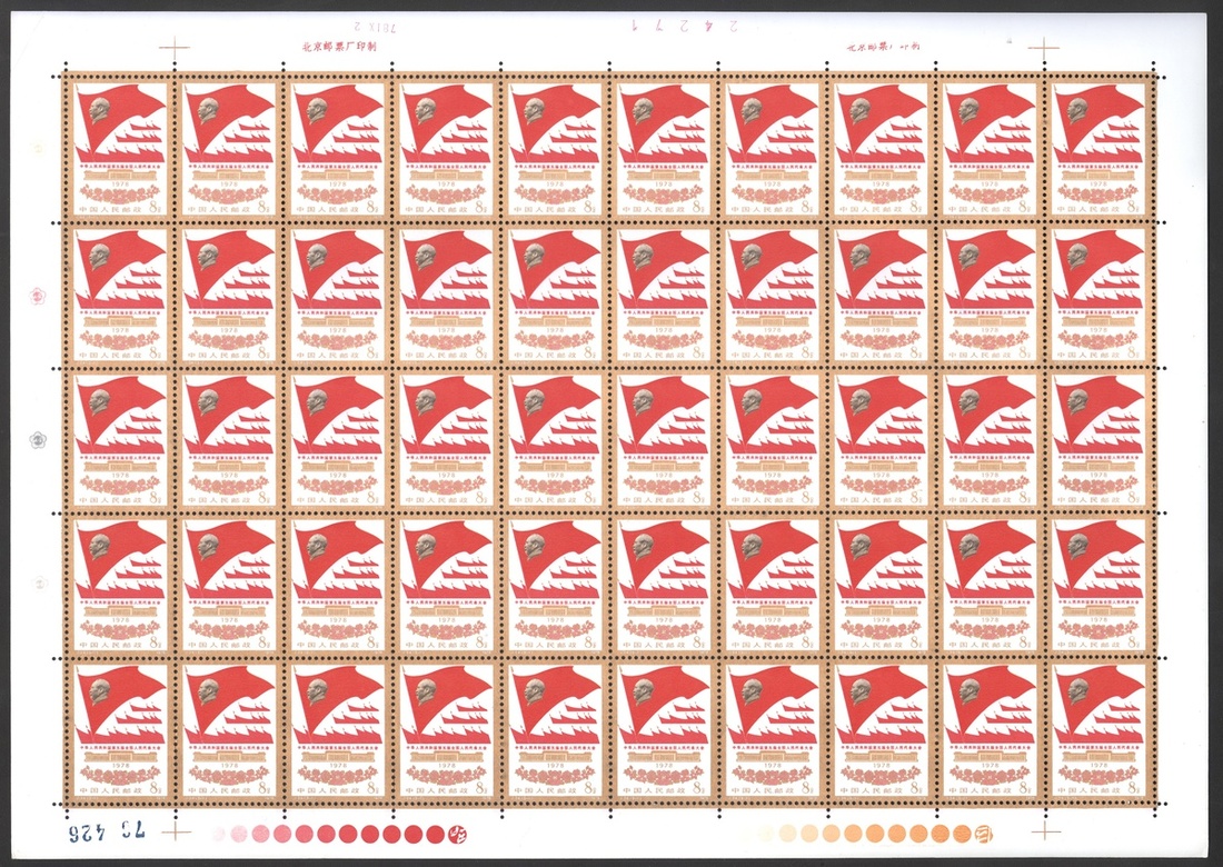 1978年J24第五屆全國人民代表大會新票50枚全張1套,邊紙完整,票面顏色鮮豔,金粉閃亮,個別票背微黃,上中品