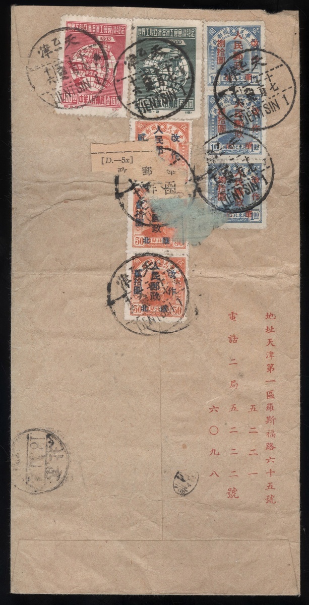 1949 (17 Nov.) Double registered envelope to Beijing bearing on reverse 1949 Peking surch. on Dr Sun Yat-sen issue $20 on 50c. (2), $80 on $1 (3), 1949 World Federation of Trade Union (C3) $100 and $300 cancelled by "Tientsin" bilingual c.d.s., showing Beijing arrival c.d.s. om front, fine. Yang NC348-349, C17-18