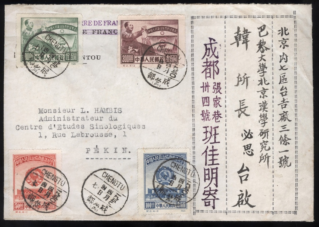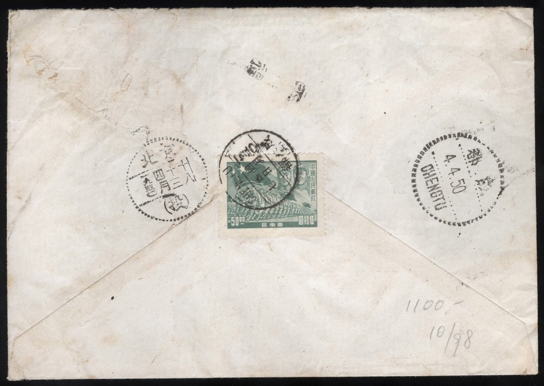 1950 (4 Apr.) envelope to Beijing (13.4) bearing on reverse 1949 Marching of People's Liberation Army $50, 1950 Chinese People's Political Conference (C2) $50 to $500 complete set of four on front, cancelled by Chengtu bilingual c.d.s., with arrival c.d.s, fine. Yang C9-C12, SW4