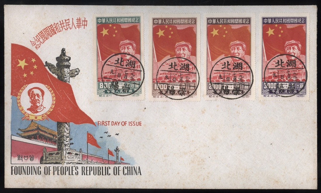 1950 (1 Jul.) First day commmemorating cover bearing Inauguration of Chinese People's Republic (C4) $800 to $3000 complete set of four cancelled by Hupei, Chongyang c.d.s., unused, fine. Yang C23-C26