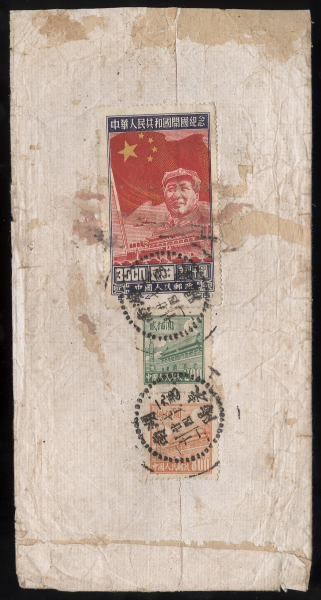 1950 (24 Jul.) Double registered envelope to Pingshun (1.8) bearing 1950 Tien An Men (R1) $200, $800 and Inauguration of Chinese People's Republic (C3) $3000 cancelled by Hunan, Laiyang dotted rim c.d.s. , showing Hankow transit c.d.s. and arrival c.d.s., fine. Yang C26, R1, R4