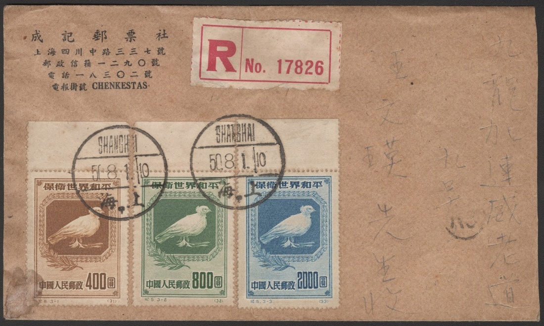1950 (1 Aug.) registered first day cover to Hong Kong (10.8) bearing Peace Campaign (C5) complete set of three cancelled by Shanghai bilingual c.d.s., with arrival c.d.s on reverse, fine.