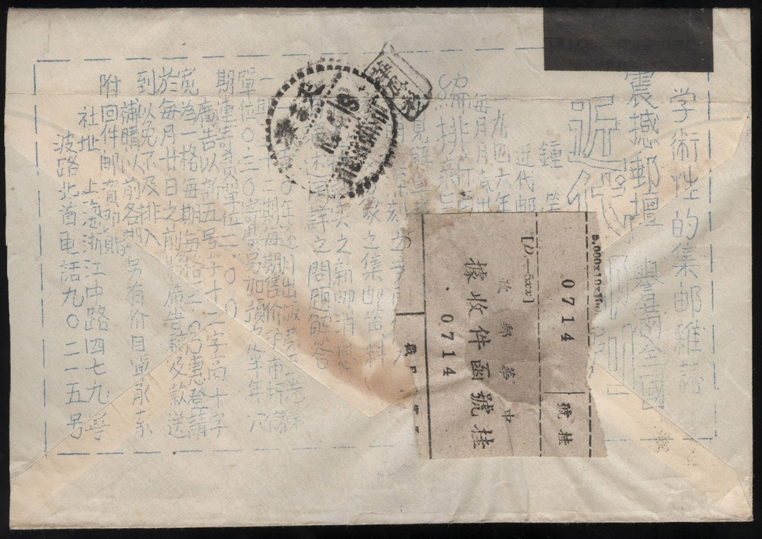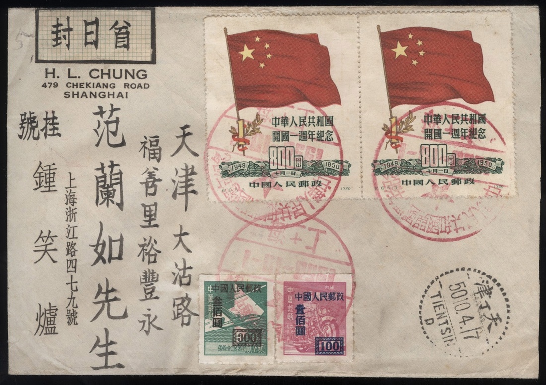 1950 (1 Oct.) Registered cover to Tientsin (4.10) bearing First Anniv. of People's Republic (C6) $800 horizontal pair, Surch. on unit issue $100 and $300 cancelled by commemorating cancellation of Shanghai, showing arrival c.d.s adjacent and on reverse, with partial registration label, fine. Yang C39, O25, O27