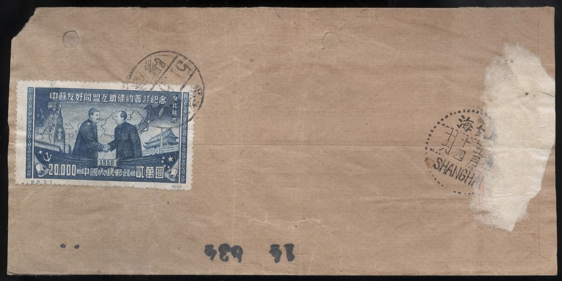 1951 (8 May) Registered envelope to Shanghai (14.5) bearing on reverse Sino-Soviet Treaty for use in North-east(C8NE) $20000 cancelled by Shenyang c.d.s., showing framed post office h.s. in red and arrival c.d.s. Yang C56