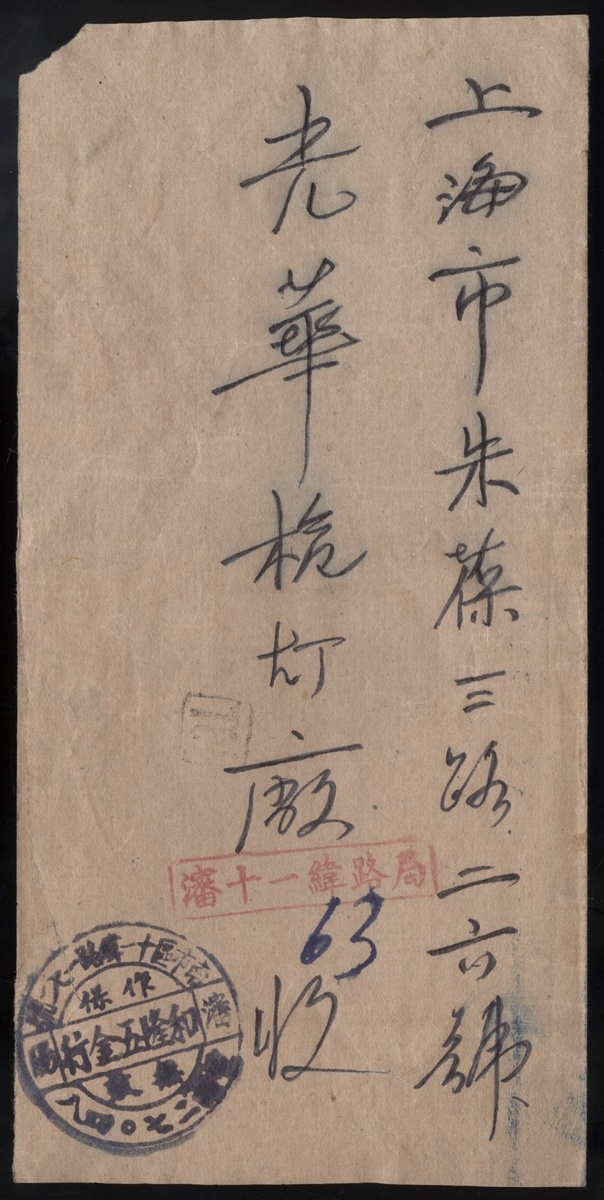 1951年瀋陽寄上海掛號封1件,貼紀東8.2萬元1枚,銷瀋陽5月8日戳,另蓋沈十一經路局掛號戳,有上海14日到達戳,保存完好
