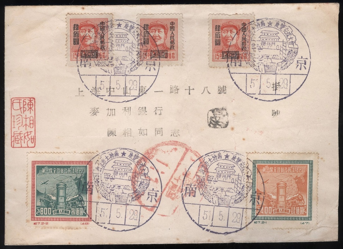 1951 (29 May.) Registered envelope to Shanghai bearing 1950 1st All-China Postal Conference (C7) complete set of two and 1950 Surch. on East China, Chairman Mao (R6) $400 on $15 (3) cancelled by Nanking Exhibition Commemorating cancelltion, with arrival c.d.s. and partial registration label on reverse, fine. Yang C47-C48, O38