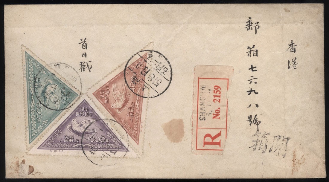 1951 (16 Aug.) Registered envelope to Hong Kong bearing Peace Campaign (C10) $400 to $1000 complete set of three cancelled by Shanghai c.d.s., fine. Yang C60-C62