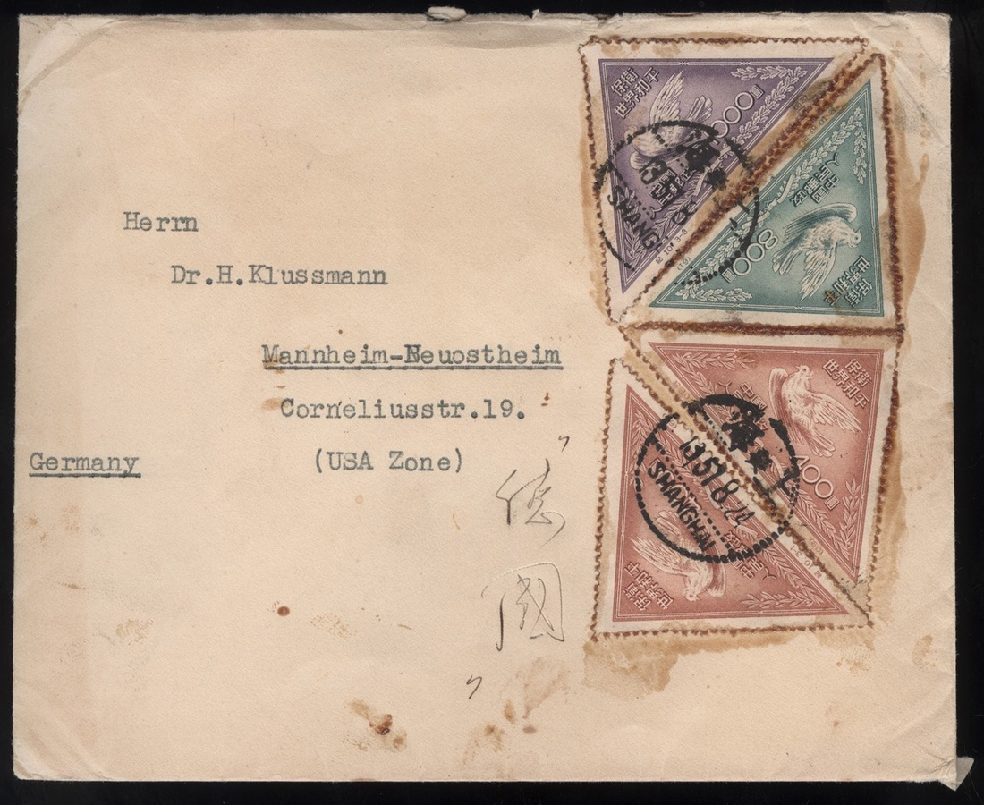 1951 (24 Aug.) envelope to Mannheim (U.S.A. zone), Germany bearing Peace Campaign (C10) $400 (2), $800 and $1000 cancelled by Shanghai bilingual c.d.s., fine.