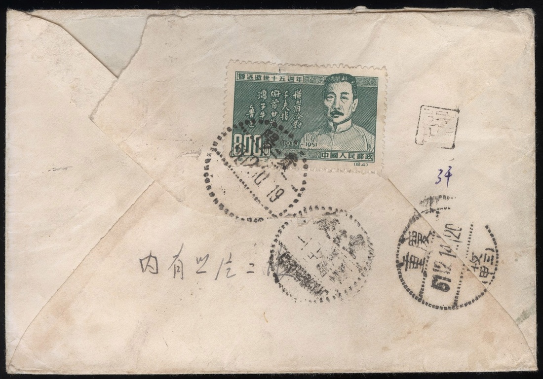 1951 (10 Dec.) envelope to Chungking bearing 15th Anniv. of Death of Lu Hsun (C11) $800 on reverse cancelled by Guiyang c.d.s., with Chungking (14.12) arrival c.d.s., fine. Yang C64