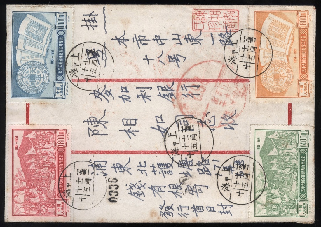 1951 (15 Dec.) Local registered first day cover bearing Centenary of Taiping Rebellion (C12) $400 to $1000 complete set of four cancelled by Shanghai c.d.s., with registration receipt, fine. yang C65-C68