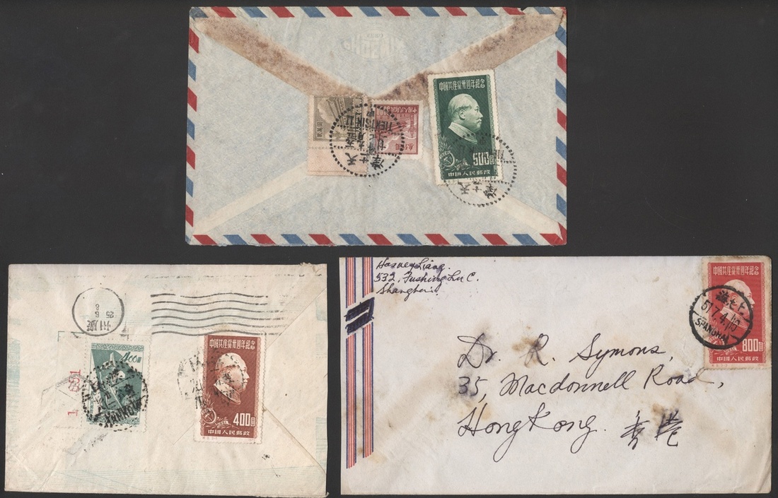 1951年貼紀9郵票實寄封3件,分貼不同面值,郵資不同,包括寄香港及及瑞士封,其中寄瑞士封混貼普52萬元郵票,分別銷廣州,天津,漢口郵戳,整體郵戳清晰,保存完好