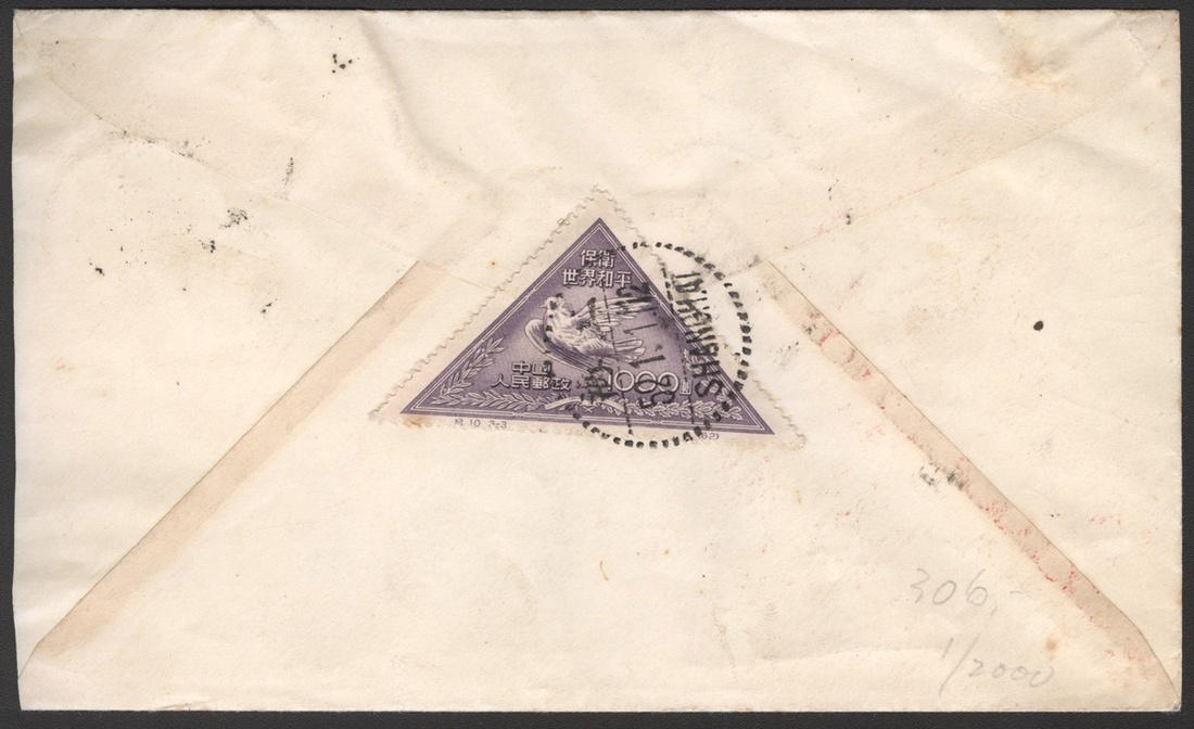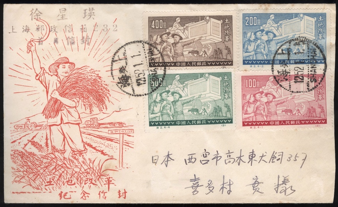 1952 (1 Jan.) Commemorating first day cover to Japan bearing Agrarian Reform (S2) $100 to $800 complete set of four and Peace Campaign (C10) $1000 cancelled by Shanghai dotted rim c.d.s., fine. Yang C62, S6-A9