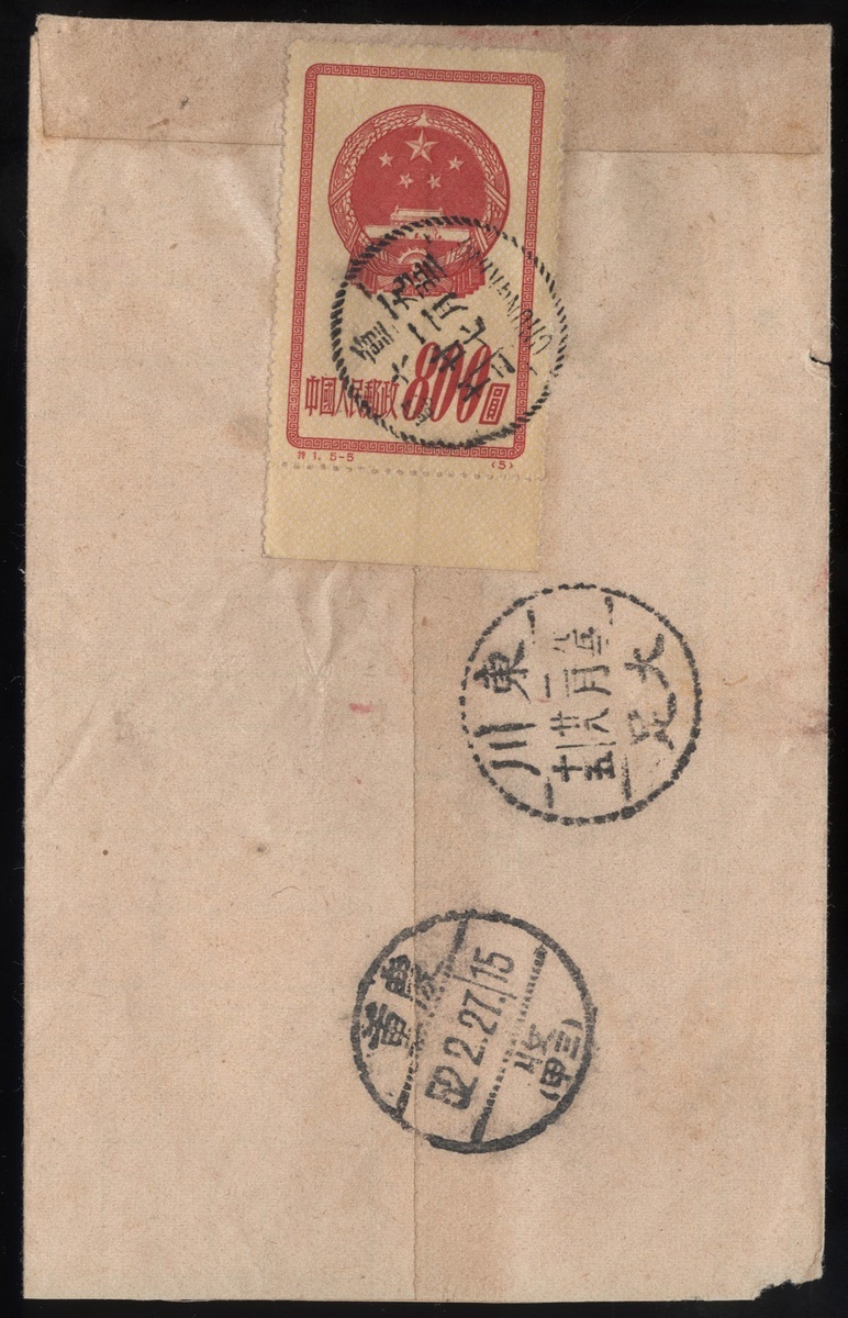1952 (27 Feb.) envelope to Dazu bearing National Emblem Issue (S1) $800 cancelled by Chongqin c.d.s. with next day arrival c.d.s., fine. Yang S5