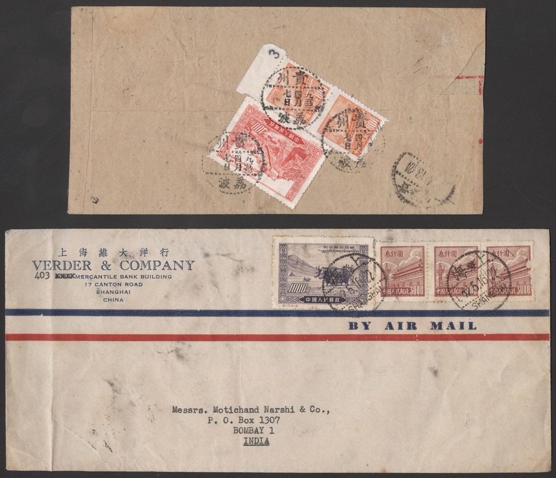 1952 a group of two covers bearing Liberation of Tibet (C13): (7 Apr.) registered envelope to Guiyang bearing $400 and Tien An Men $800 (2) cancelled by Libo (16 May) airmail to India bearing $1000 and Tien An Men $3000 (3) cancelled by Shanghai c.d.s., fine.
