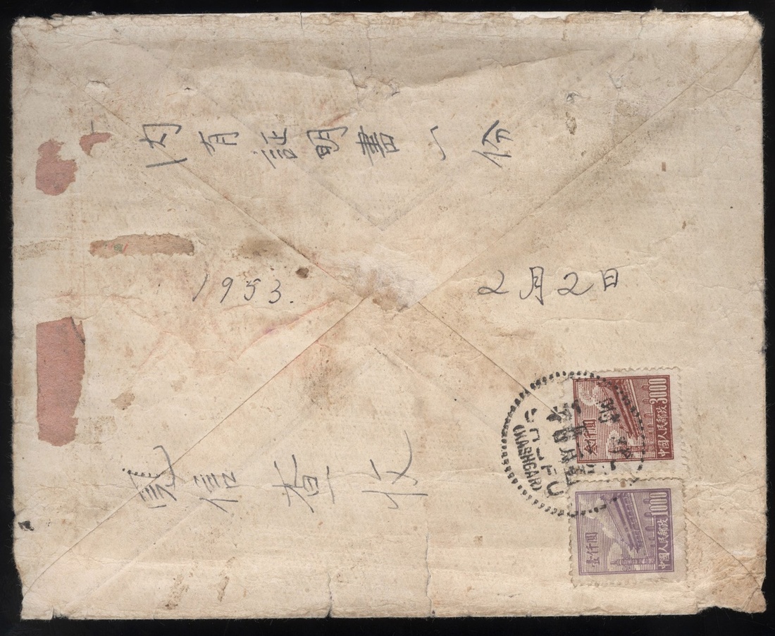 1953 (5Feb.) Airmail cover to Chengku (28.2) bearing on reverse Tien An Men $1000 and $3000 cancelled by Shufu dotted rim c.d.s., with "Tihwa" (21.2) transit c.d.s. and Chengku arrival c.d.s. adjacent, fine.