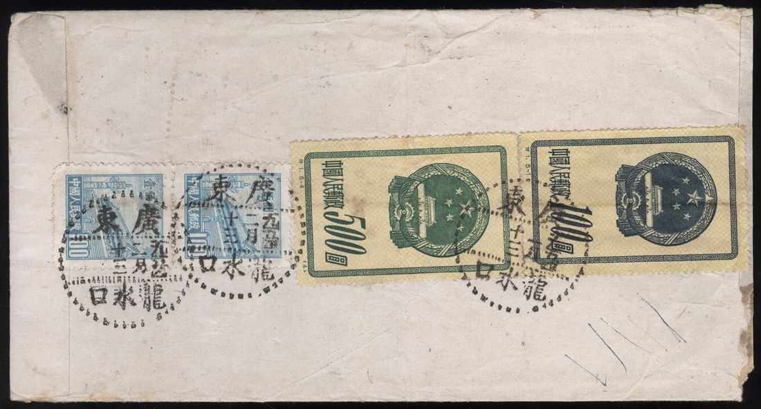 1954 (13 Feb.) envelope to Hong Kong bearing National Emblem Issue (S1) $500 (2), Tien An Men 3rd print (R3) $100 (2) cancelled by Longshuikou c.d.s., fine. Yang S4, R13