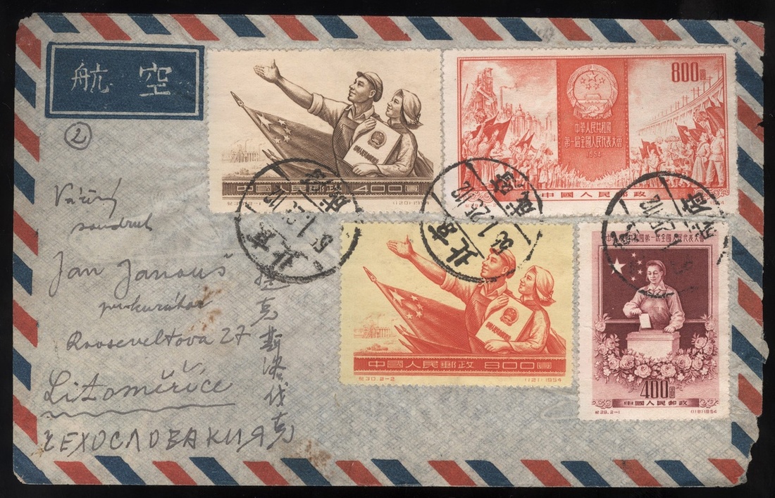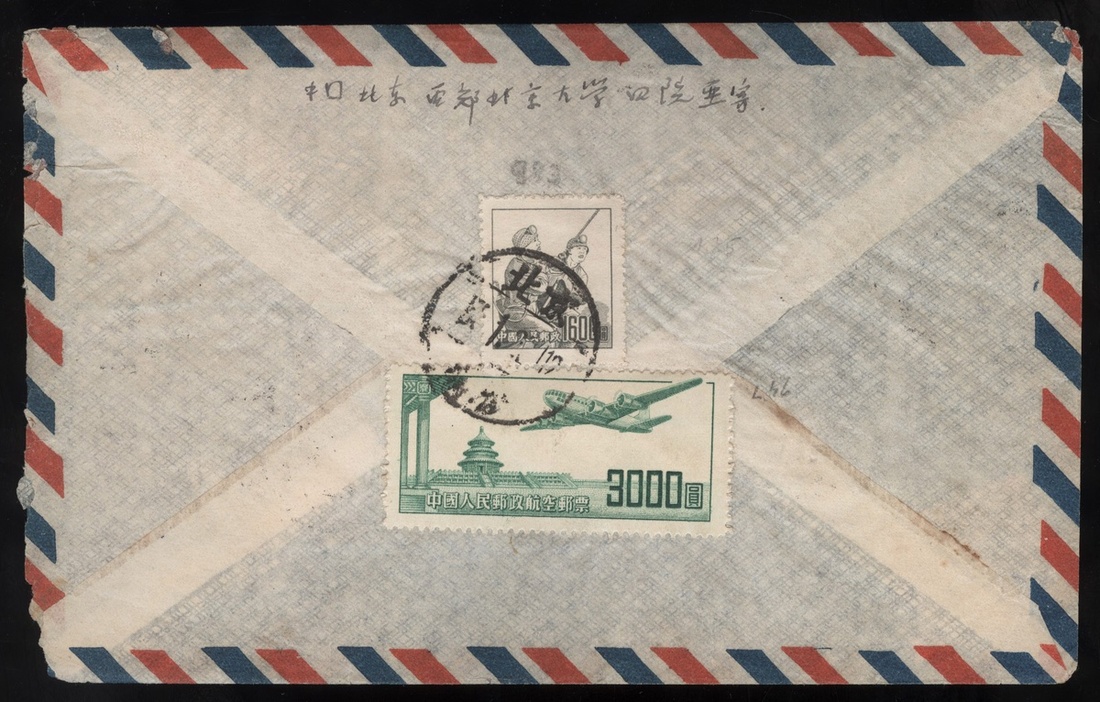 1955 (25 Jan.) Airmail cover to Czech bearing C29 $400 and $800, C30 $400 and $800, air mail stamp $3000 on reverse cancelled by Peking c.d.s., fine
