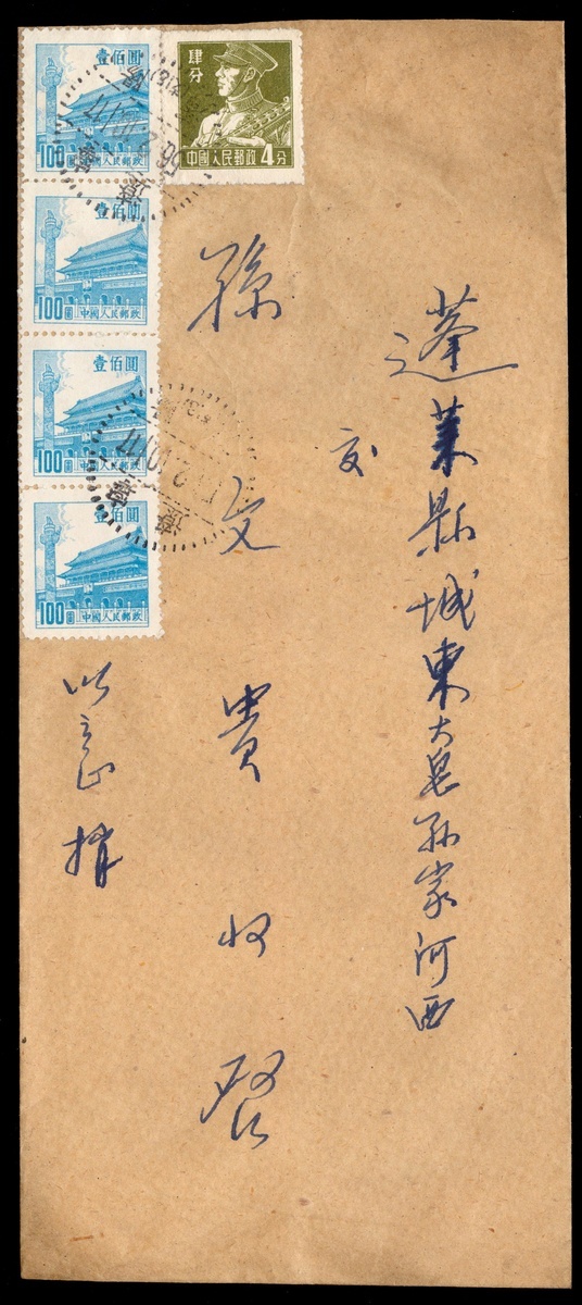 1956 (10 Feb.) envelope to Penglai bearing R7 $100 in stripe of four and R8 4f. cancelled by Liaoning c.d.s. with arrival c.d.s (19.2) on reverse.