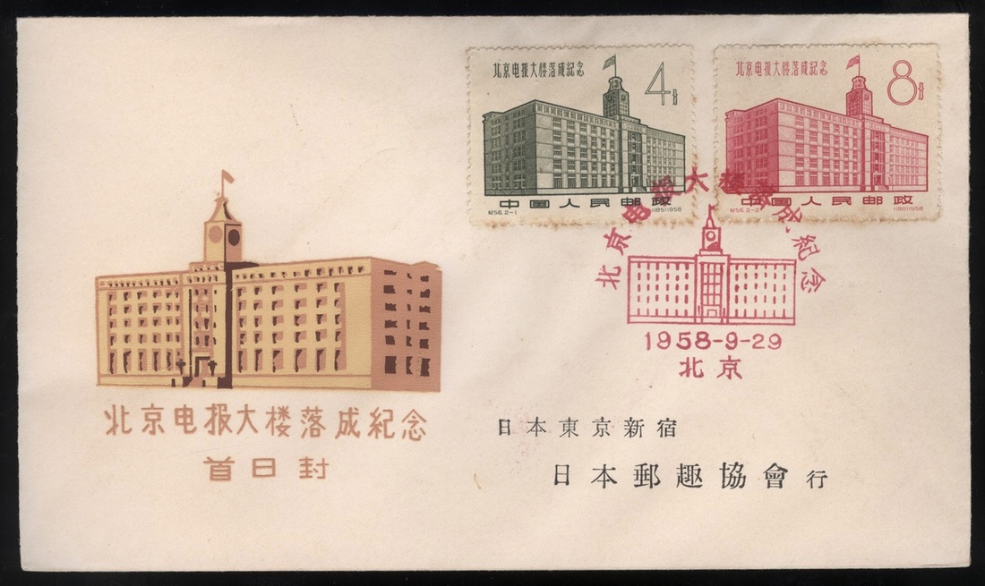 1958 (29 Sep.) Commemorating first day cover bearing Opening of Peking Telegraph Building (C56) 4f. and 8f. complete set of two with commemorating h.s. in red, fine, unaddressed. Yang C185-C186