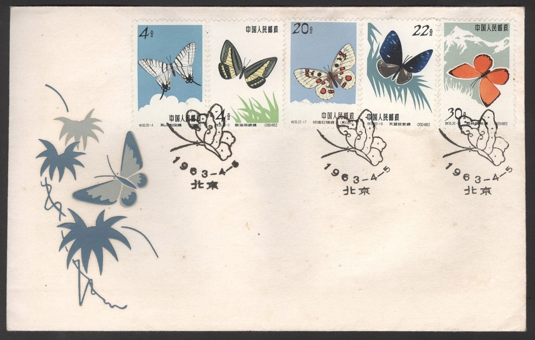 1963年中國集郵總公司發行特56蝴蝶首日封1套4件,分貼全套郵票,銷北京首日紀念戳,未實寄,保存完好