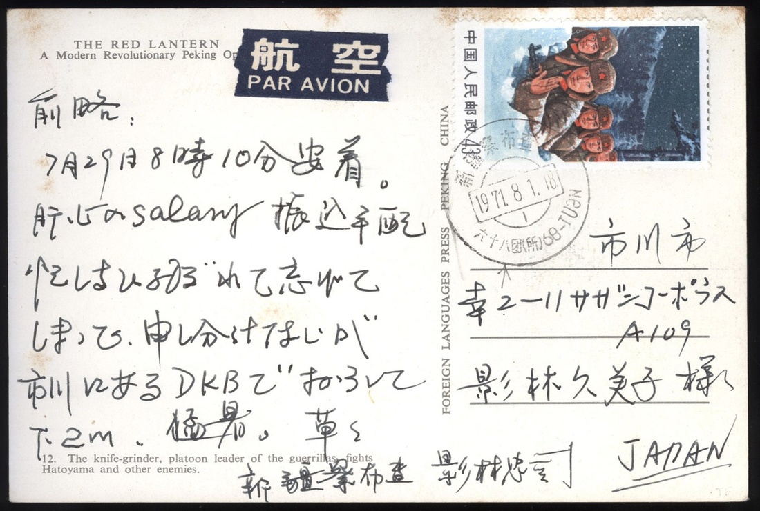 1971 (1 Aug.) A "The Red Lantern" postcard air mail to Japan bearing W19 43c. tied by Sinkiang military bilingual c.d.s.