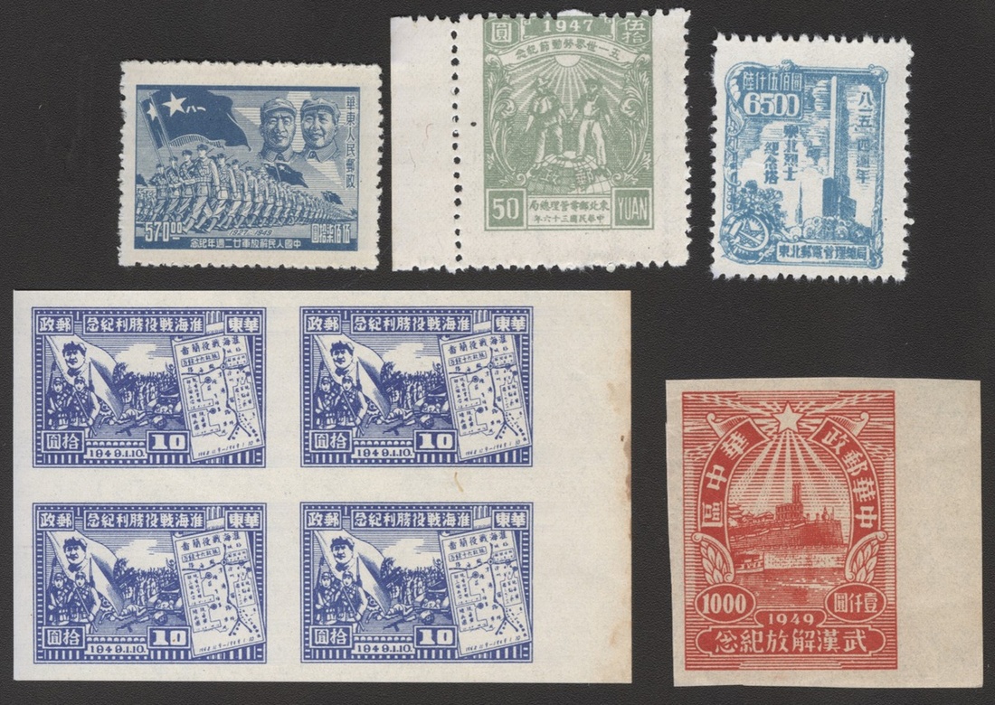 解放區新票一組,包括淮海戰役無齒票四方連5種,武漢解放無齒1套,華東進軍圖1套,東北勞動節1套,八一五紀念1套,整體上中品