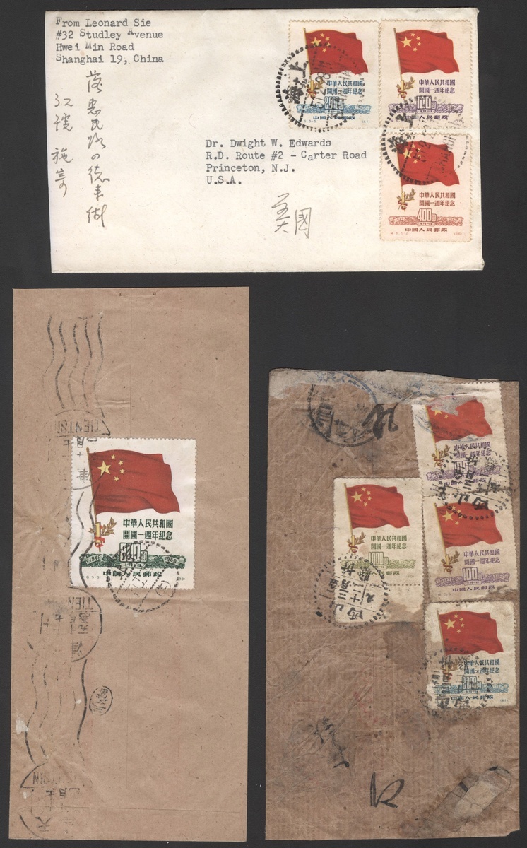 1950-51年貼紀6郵票實寄封3件,分貼不同面值,包括掛號平信,銷北京,上海,山西忻州等地郵戳,郵戳清晰,保存完好