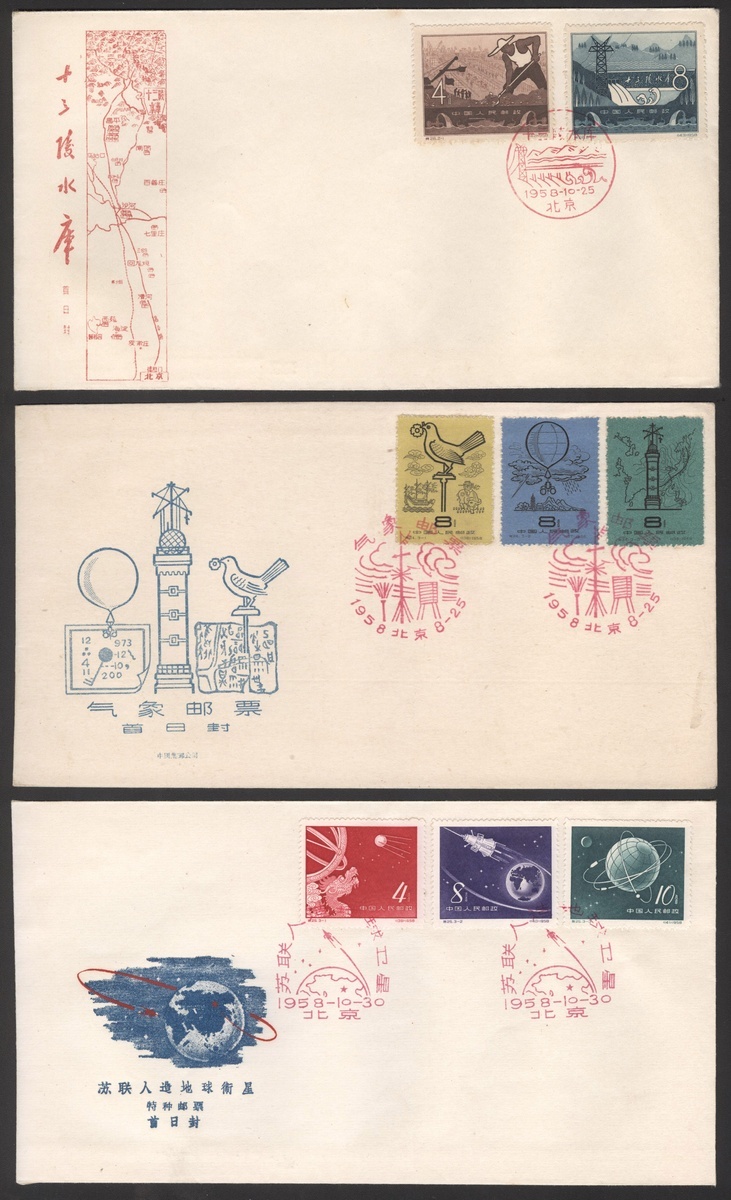 1958 a group of three first day covers including Meteorological Work (S24), Soviet Sputniks (S25), Ming Tombs Reservoir (S26). Yang S136-S143.